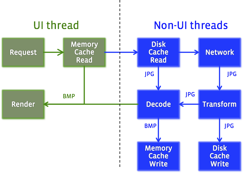 在移动设备上显示一张图片要涉及很多步骤,如果我们把这些步骤看作是pipeline而不是loader,那么事情会完全不一样。每一步都应该尽可能的独立于其他步骤,每一步获得一些参数的输入,而产出一些结果。一些可能需要可以并行,一些需要串行。有一些仅仅需要在一些特定条件下执行,有一些对执行他们的线程有特定要求。而且考虑到弱网络和大图片,我们希望用户可以尽可能快的看到图片,即使是图片并没有完全下载下来。