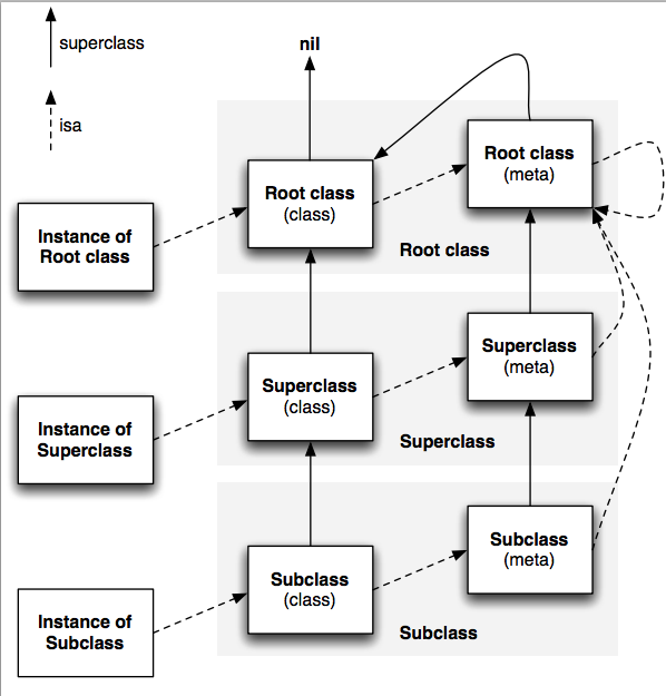 metaclass也是一个实例,也有父类,也有isa和super_class。最终的源头是一个特殊的root class。不过metaclass的isa指针其实是无关紧要的,因为现实中,没有人会给metaclass object发送消息的。